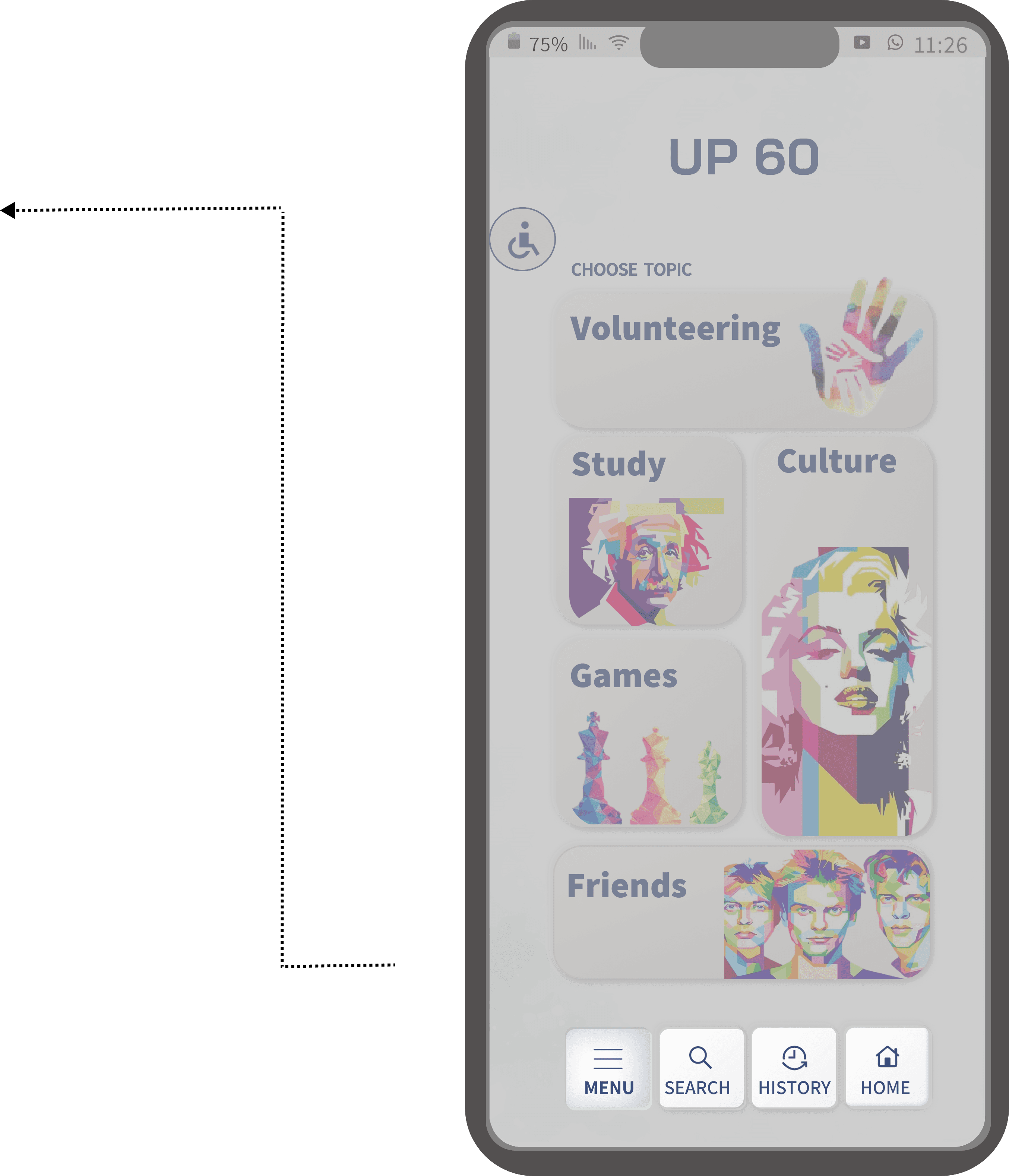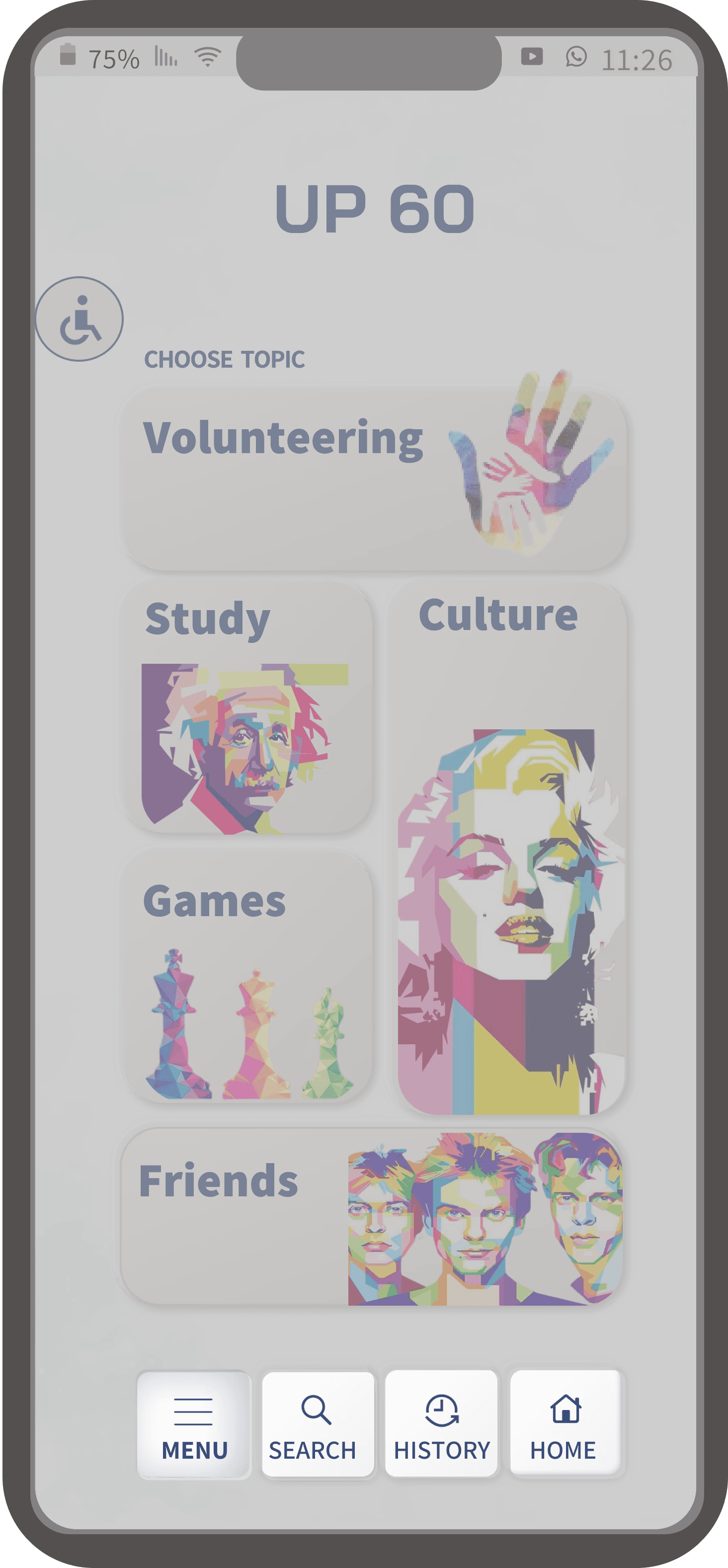 The application intended for the elderly aims to integrate all the relevant interests of the user. It encompasses five main areas: social community, culture, volunteering, studies and sports. The goal is to connect adults to enriching activities in these areas.